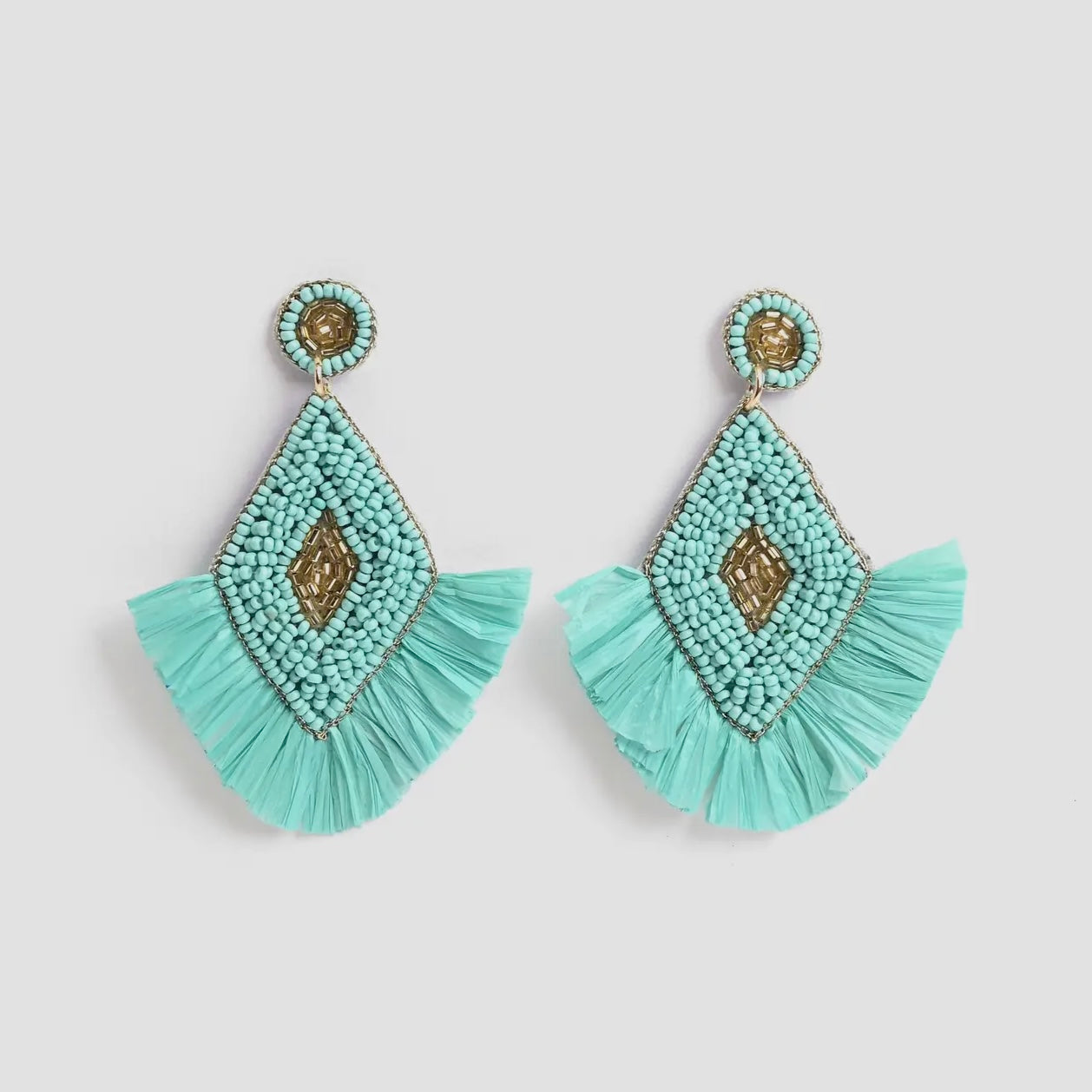 Diamond shape Raffia Earrings, Crafted in Aqua Green shade with Golden accents, Fringed raffia detailing at the base