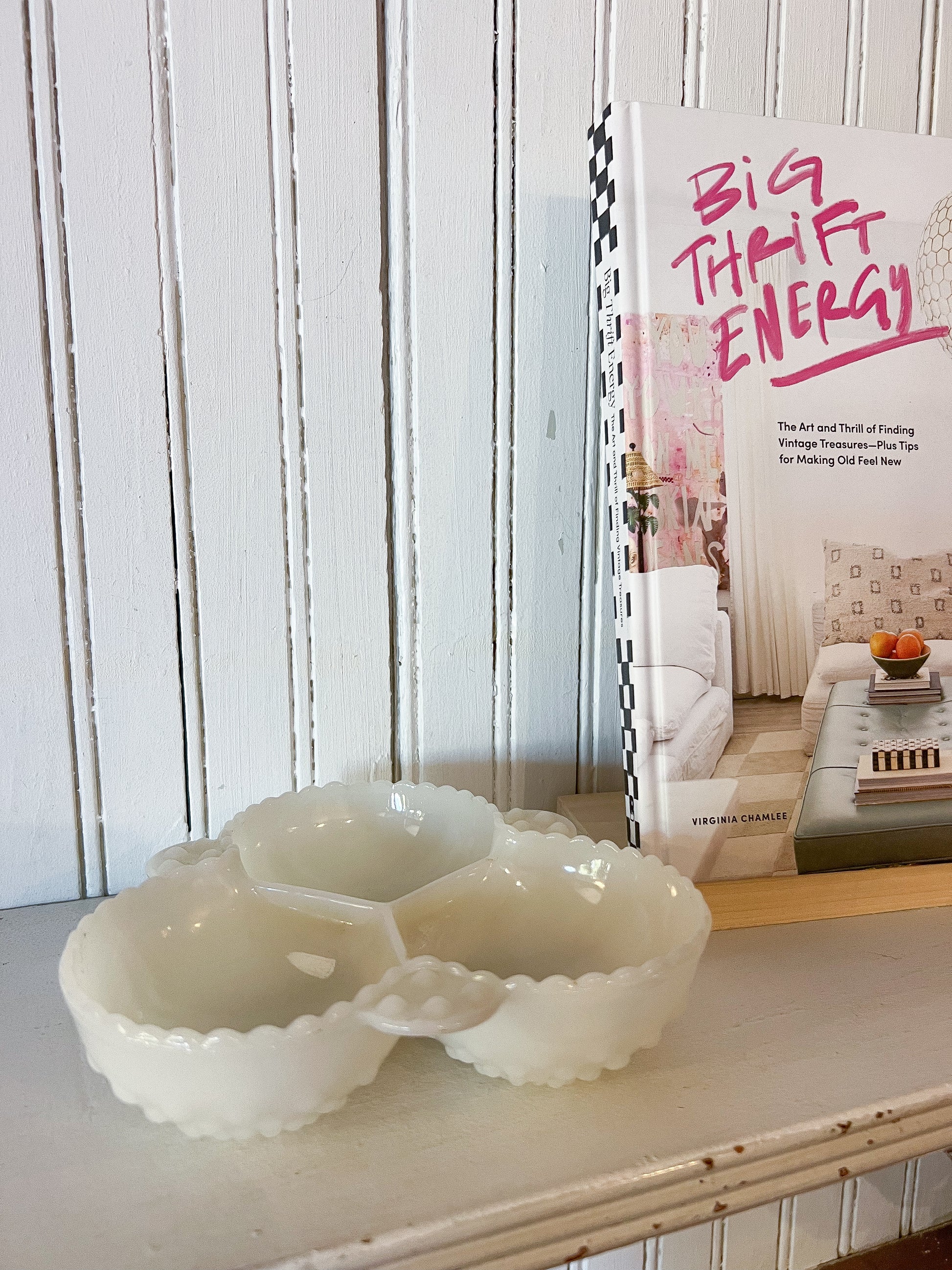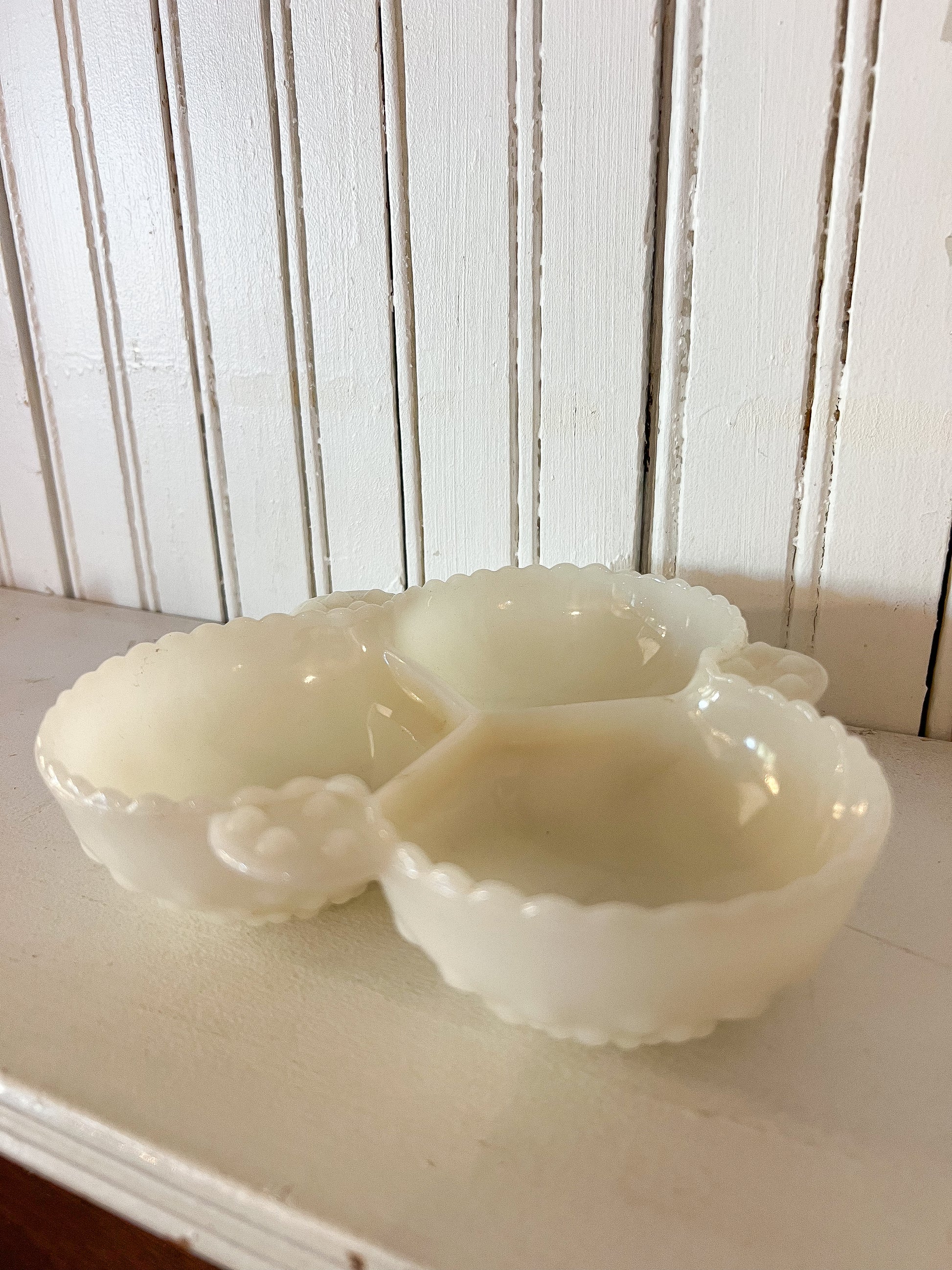 A darling 3-section dish with a soft pearly glow ... perfect for candies, jewelry, or a touch of vintage charm on your vanity.