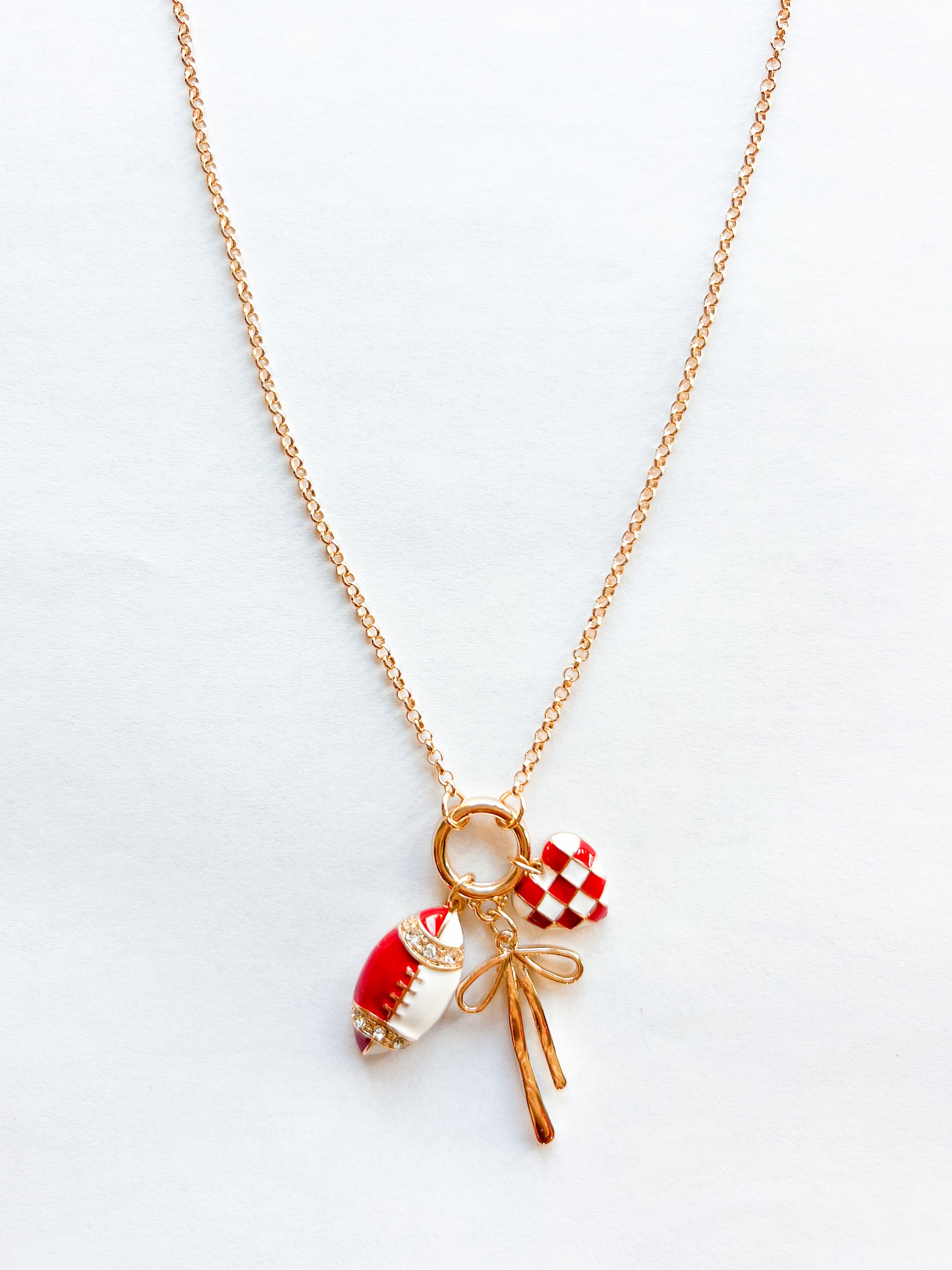 The perfect game day charm necklace featuring a red-and-white football, checker heart, and dainty gold bow. A subtle nod to our favorite Nebraska Huskers fans while staying cute and versatile for any team colors.