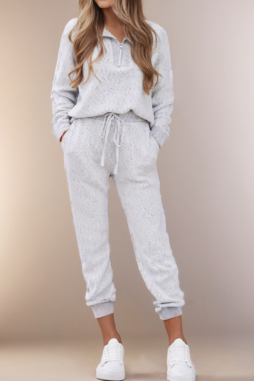 Introducing our Ashen Casually Chic Set, a perfect fusion of comfort and style that redefines casual sophistication. This lighter-weight ensemble features jogger pants paired with a half-zip pullover sweatshirt, crafted from an exceptionally soft fabric that feels luxurious against your skin. The serene light ash grey color adds a touch of refinement, making it versatile enough for both lounging at home and running errands in style. With its relaxed fit and modern silhouette, the Ashen Casually Chic Set is designed for those who appreciate understated grace. Embrace effortless style and unparalleled comfort with this must-have addition to your wardrobe. Available in store and online.