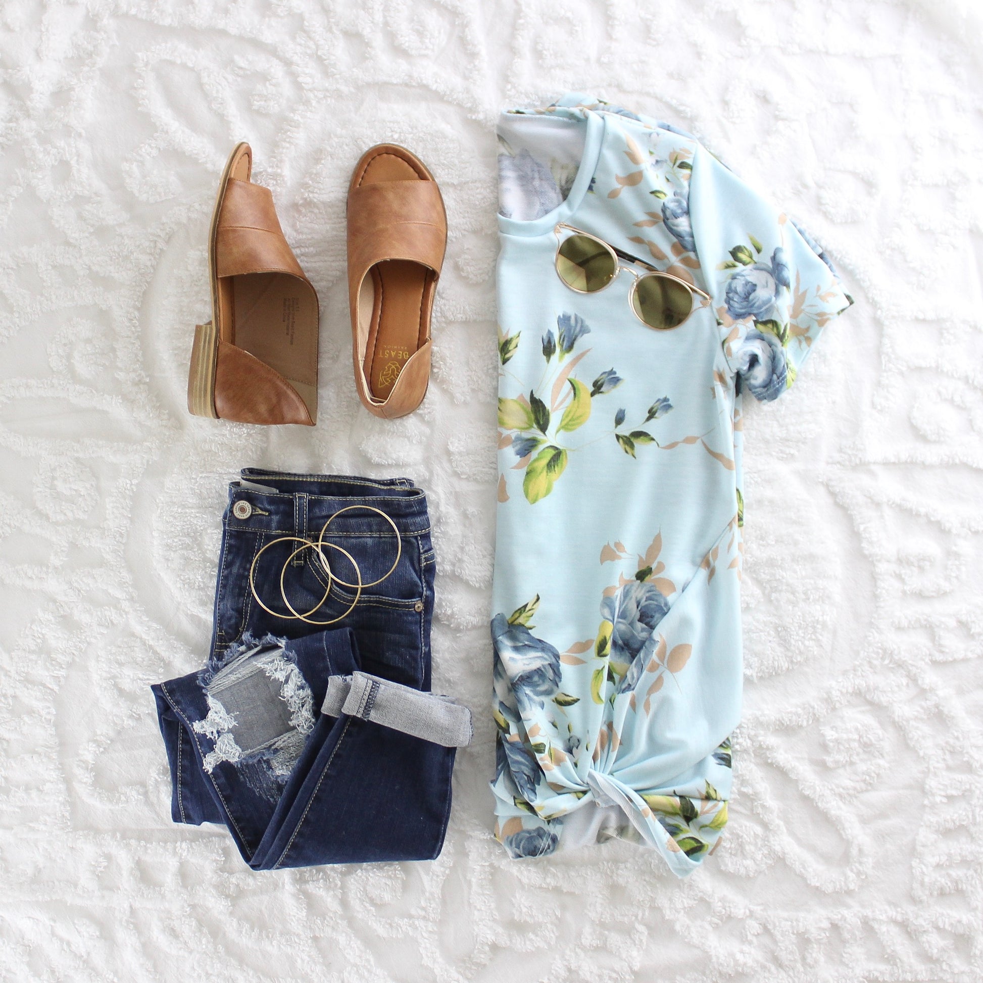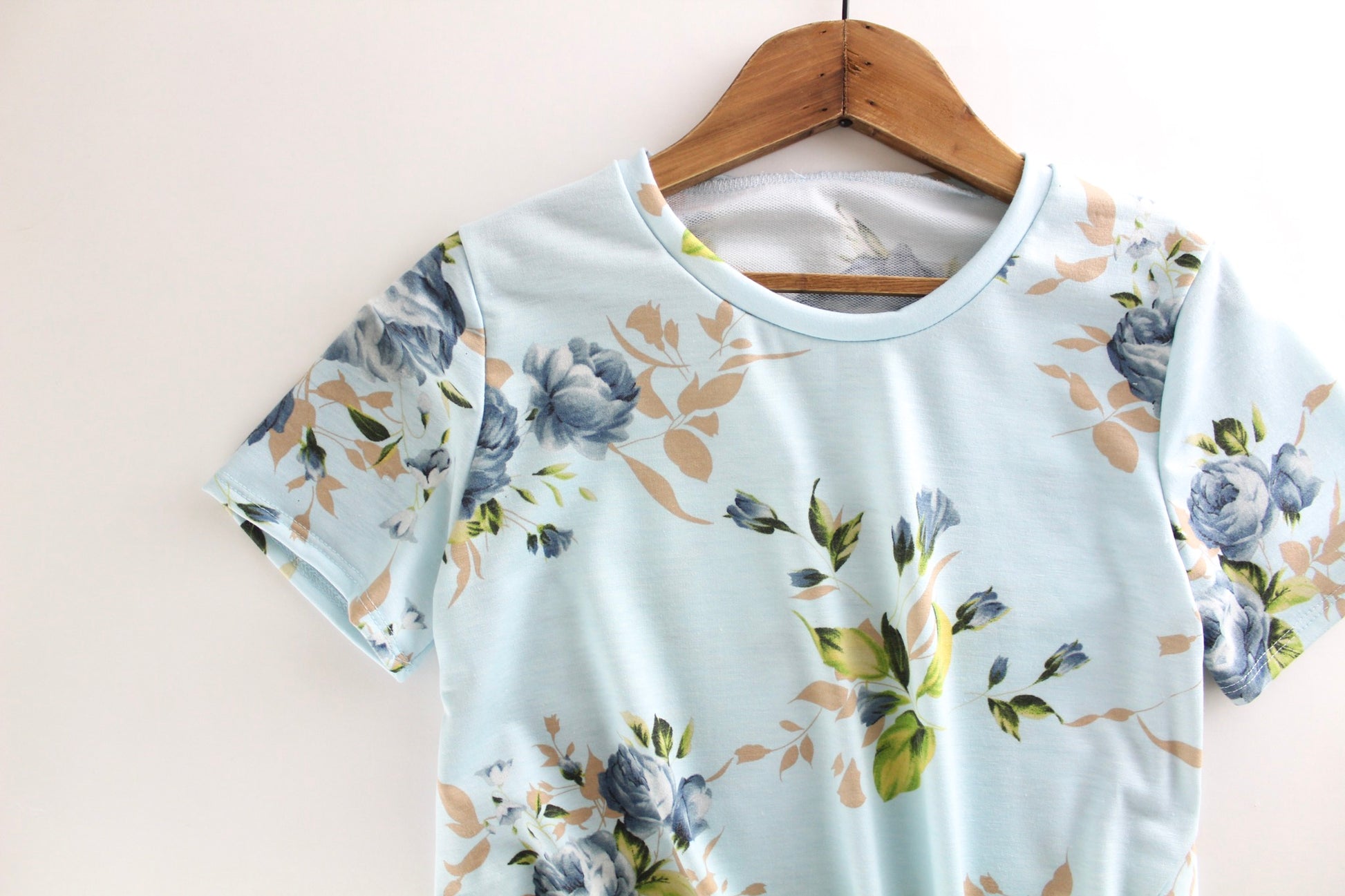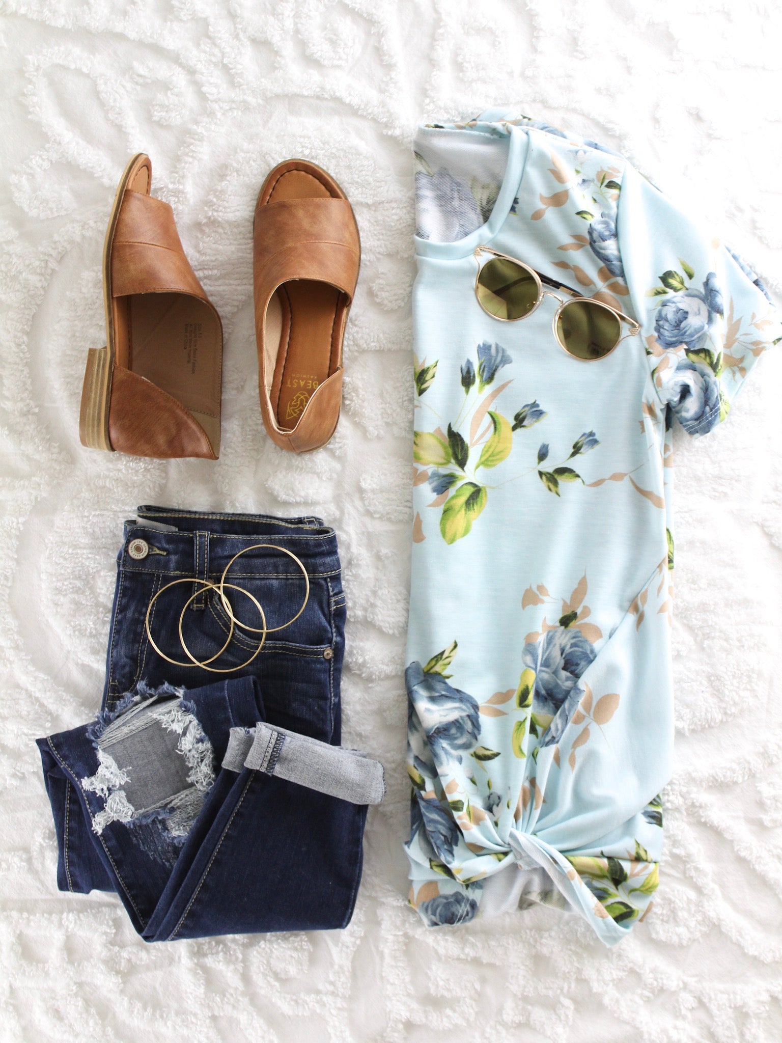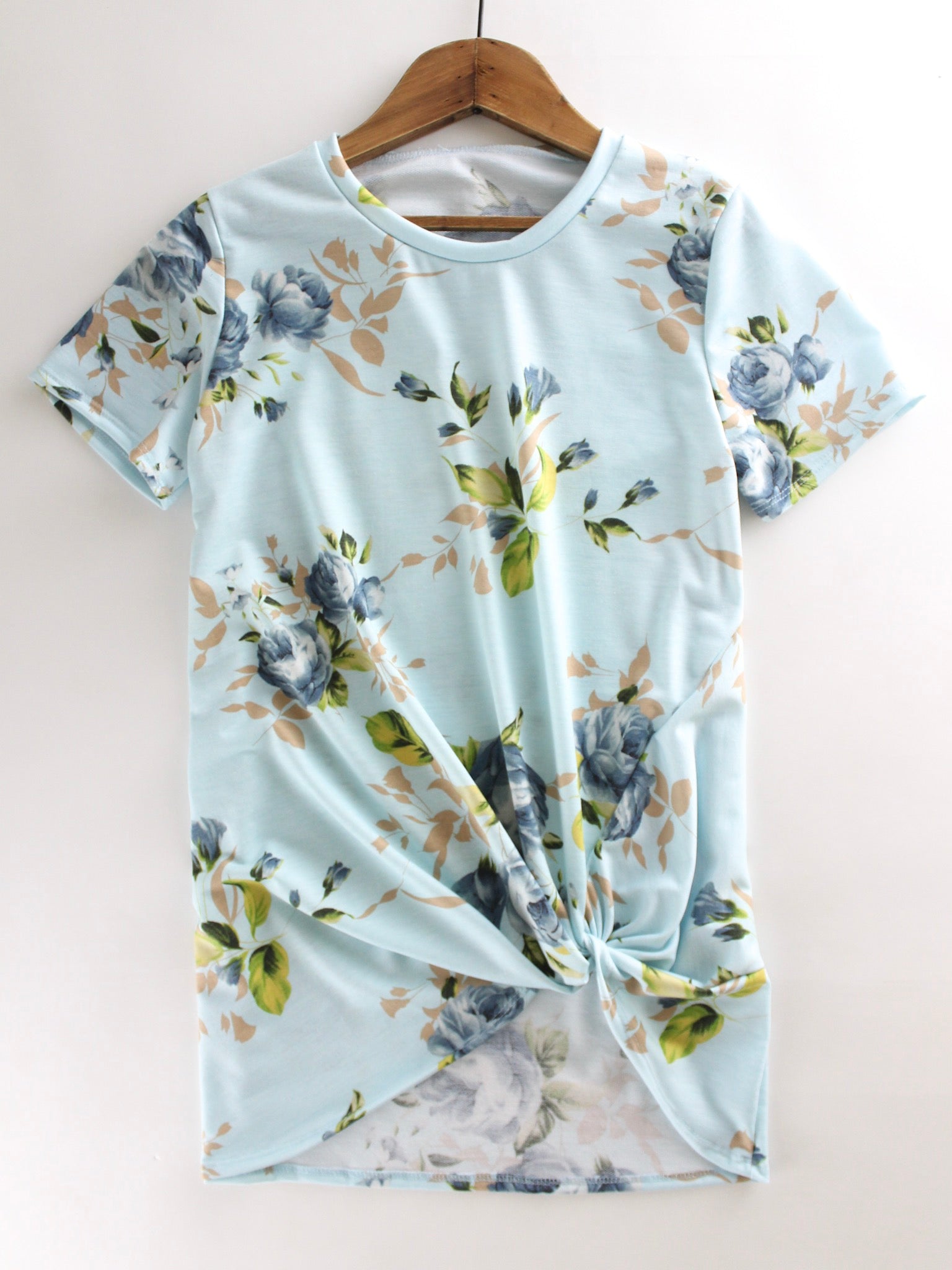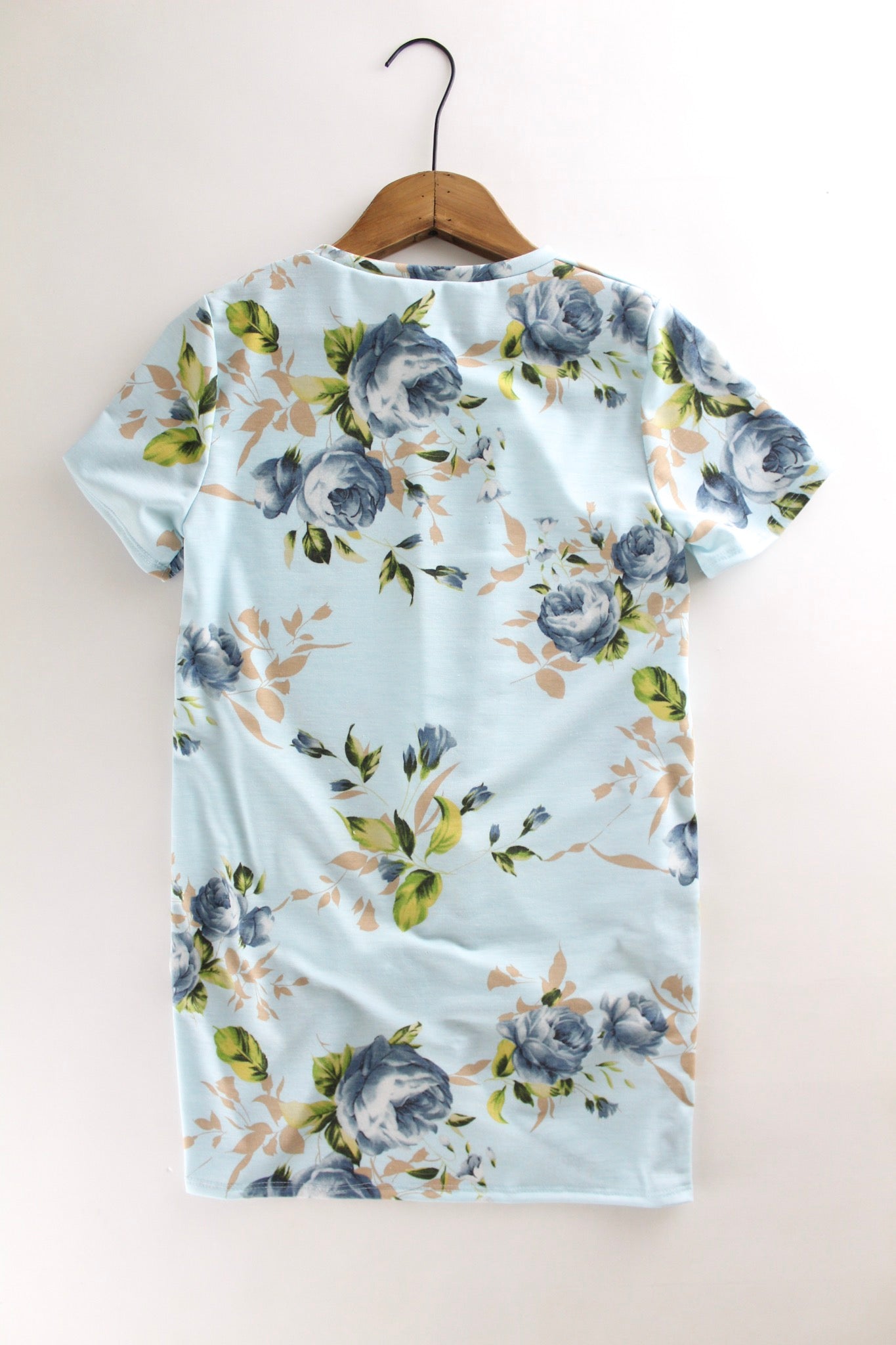 Bring on Spring! This light blue floral top features short sleeves and a side knit hem for easy breezy style all Spring and Summer long! The extra long length is perfect for wearing with your favorite leggings or skinnies.