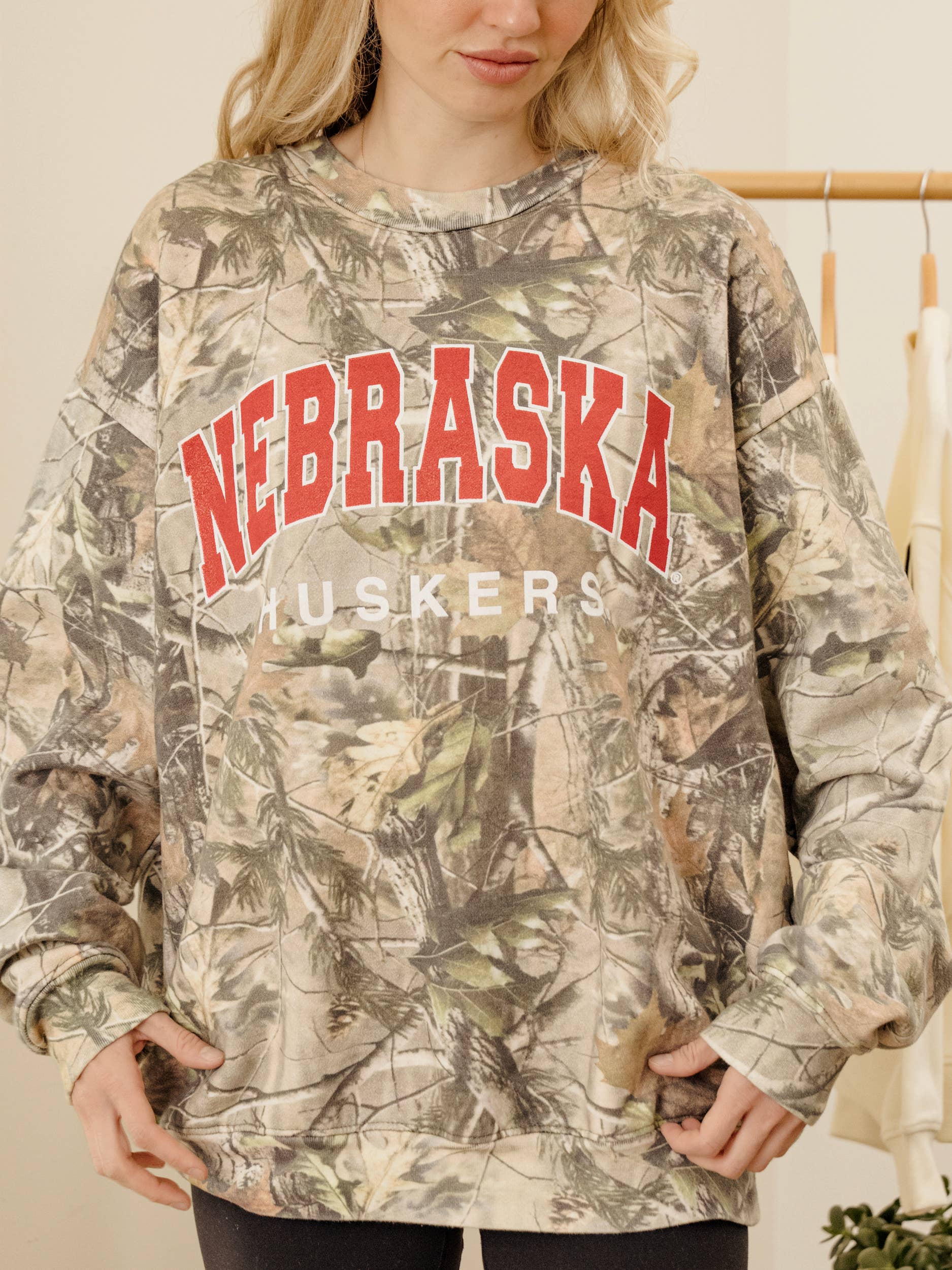 Blend in while standing out. The Nebraska Camouflage Sweatshirt pairs a bold Nebraska Huskers graphic with an all-over camo print for the perfect mix of sporty spirit and laid-back edge. Designed with a relaxed, oversized fit, it’s the ultimate game-day layer… whether you’re cheering from the stands, tailgating with friends, or cozying up at home. The soft, mid-weight fabric keeps you comfy while the eye-catching red logo makes sure your team pride never gets lost in the crowd. Available in store and online.