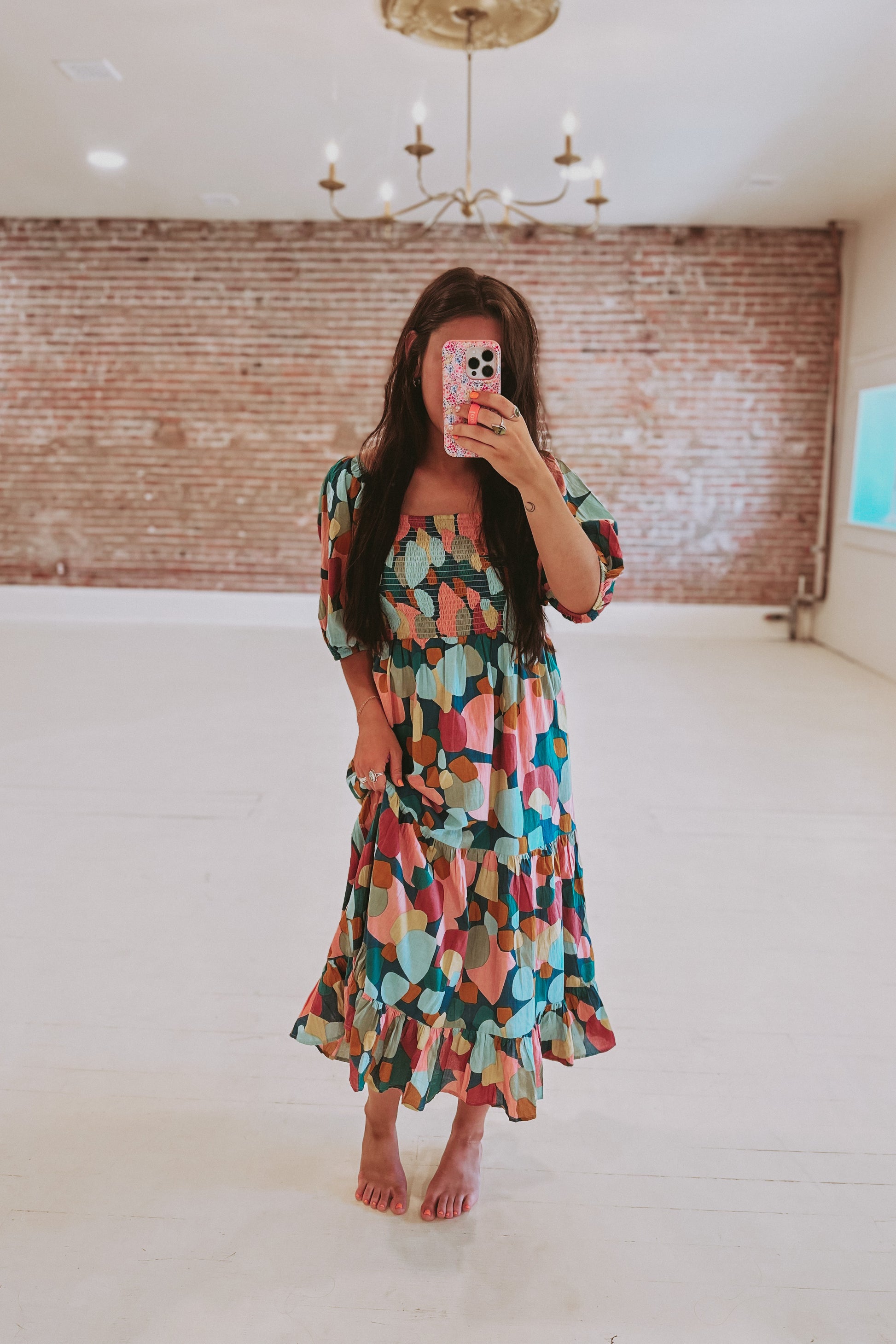 Perfect for any occasion, wearable in any season, this is truly the most versatile dress! The Midsummer's Dream Dress features a fun abstract pattern, adorable puff sleeves, smocked bodice, and pockets.