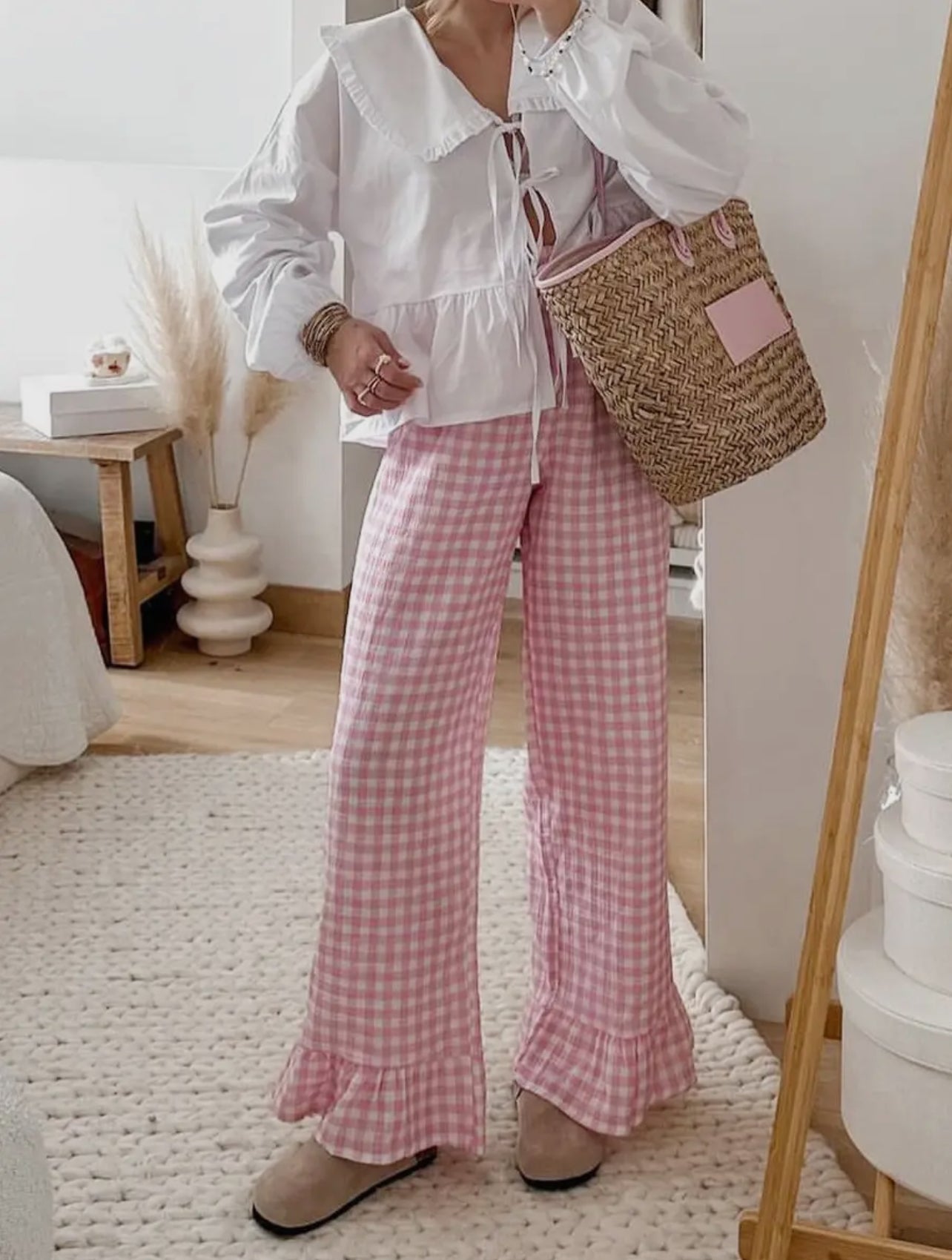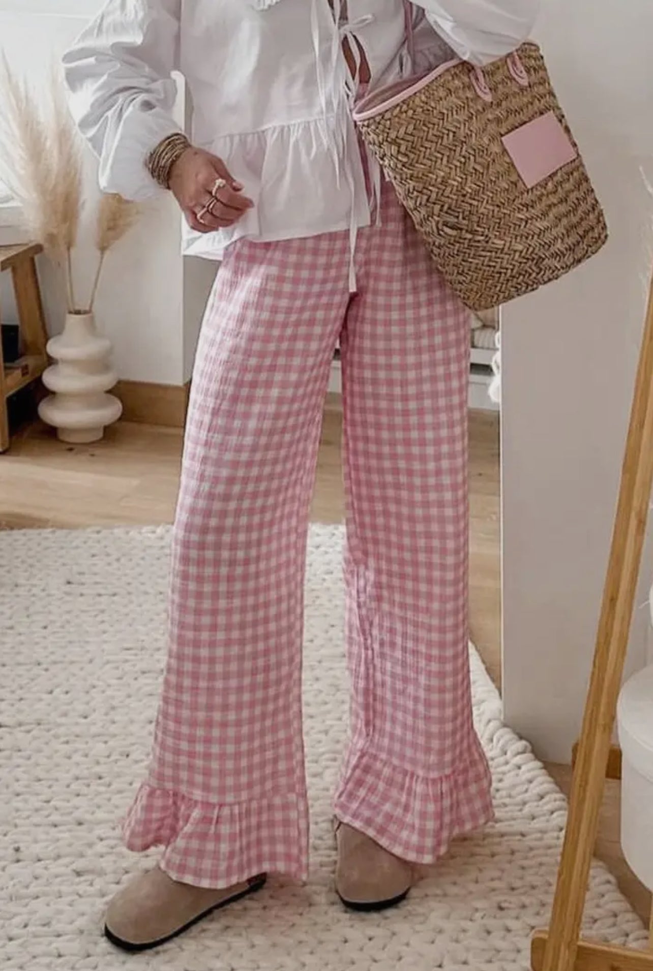 Featuring a button-down front that's as easy to wear as it is adorable, this set is perfect for those days when you want to feel cute without sacrificing comfort. The ruffled details at the bottom of both the top and pants add a playful touch that’ll make you feel like the queen of your little boujee, cozy castle.