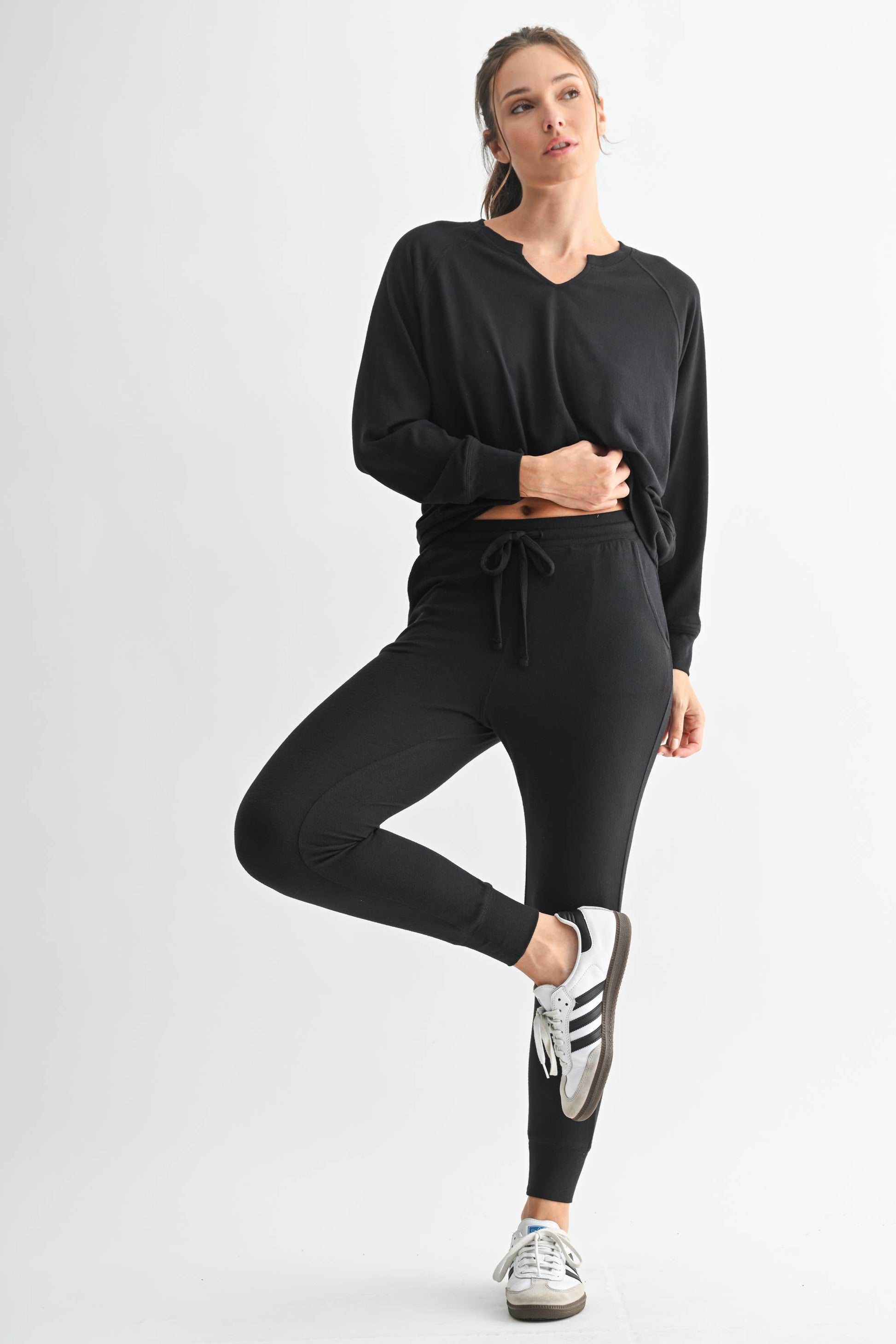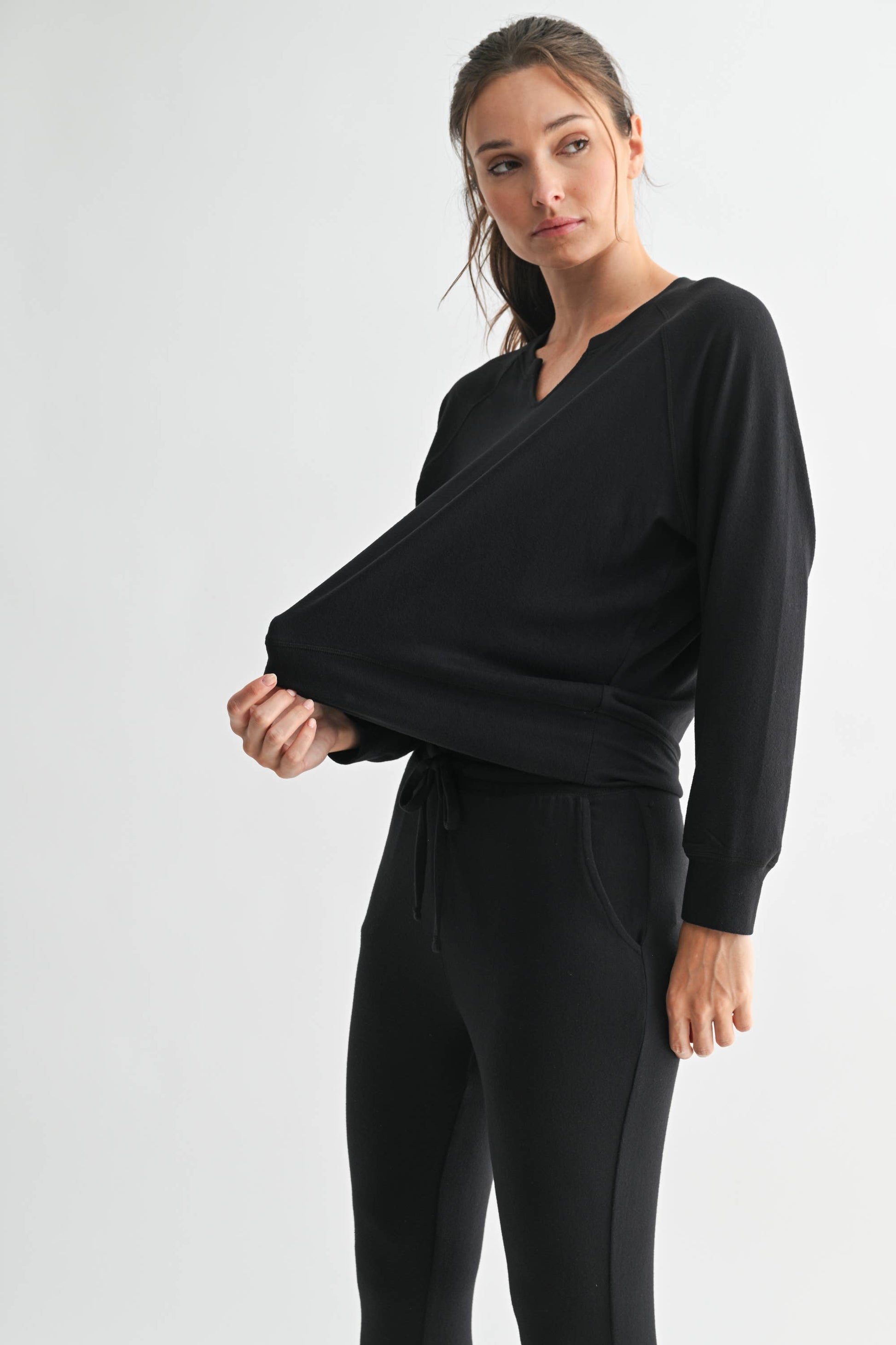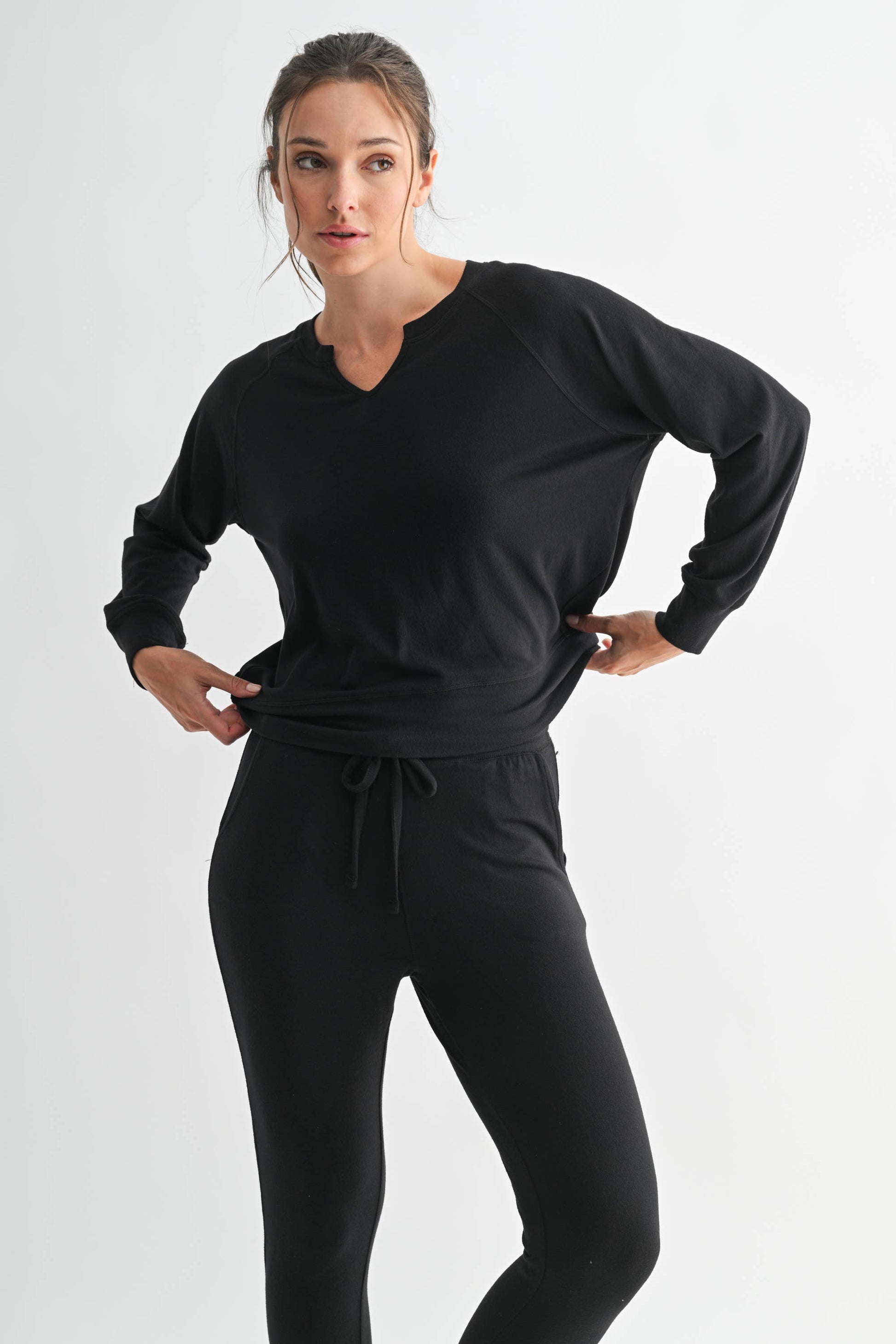 Slip into pure, cloud-like comfort with the Cloud Kissed Henley. Crafted from our dreamy, best-selling Hacci fabric, this long sleeve is soft, breathable, and perfectly slouchy…ideal for lounging, layering, or living your best cozy life. The Henley-style detail and gentle V-neckline add a touch of effortless charm, while the lightweight feel makes it a year-round go-to. Available in three versatile hues… Oatmilk, Golden Hour, and Black…so you can match your mood, your joggers, or your coffee order. Available in store and online.
