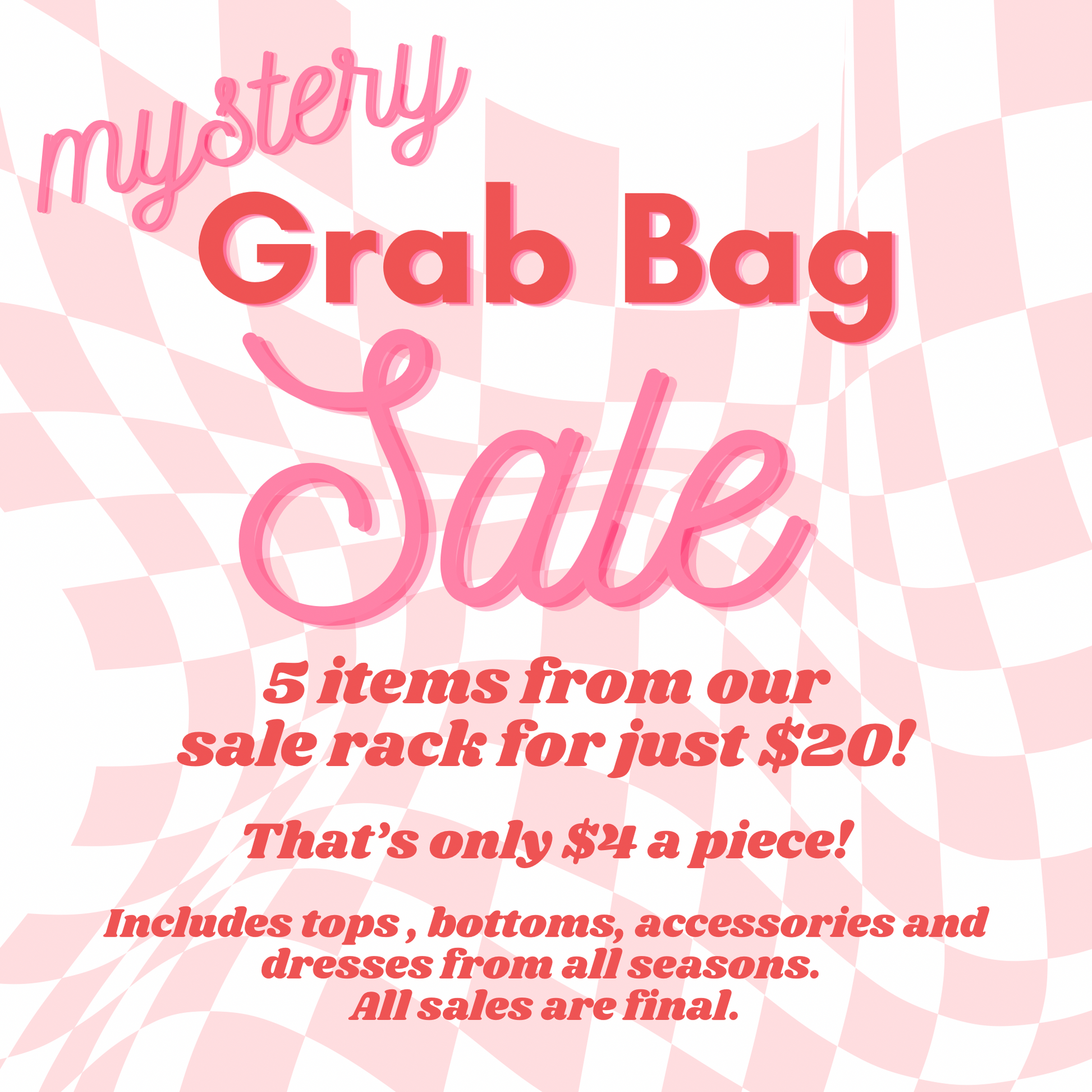 Hurry! Limited stock! 5 items from our sale rack for $20. TWENTY DOLLARS!!! FIVE ITEMS!!!! That's $4 a piece you guys! Pieces will include tops, bottoms (sized XS, S, M, L, XL), dresses and accessories from all seasons. We will randomly hand pick the cutest items by size, bag them up and ship them to you. Because who doesn't love a good surprise?! SO FUN!! This is a serious clearance! All sales are final. No exceptions. Please and thank you!