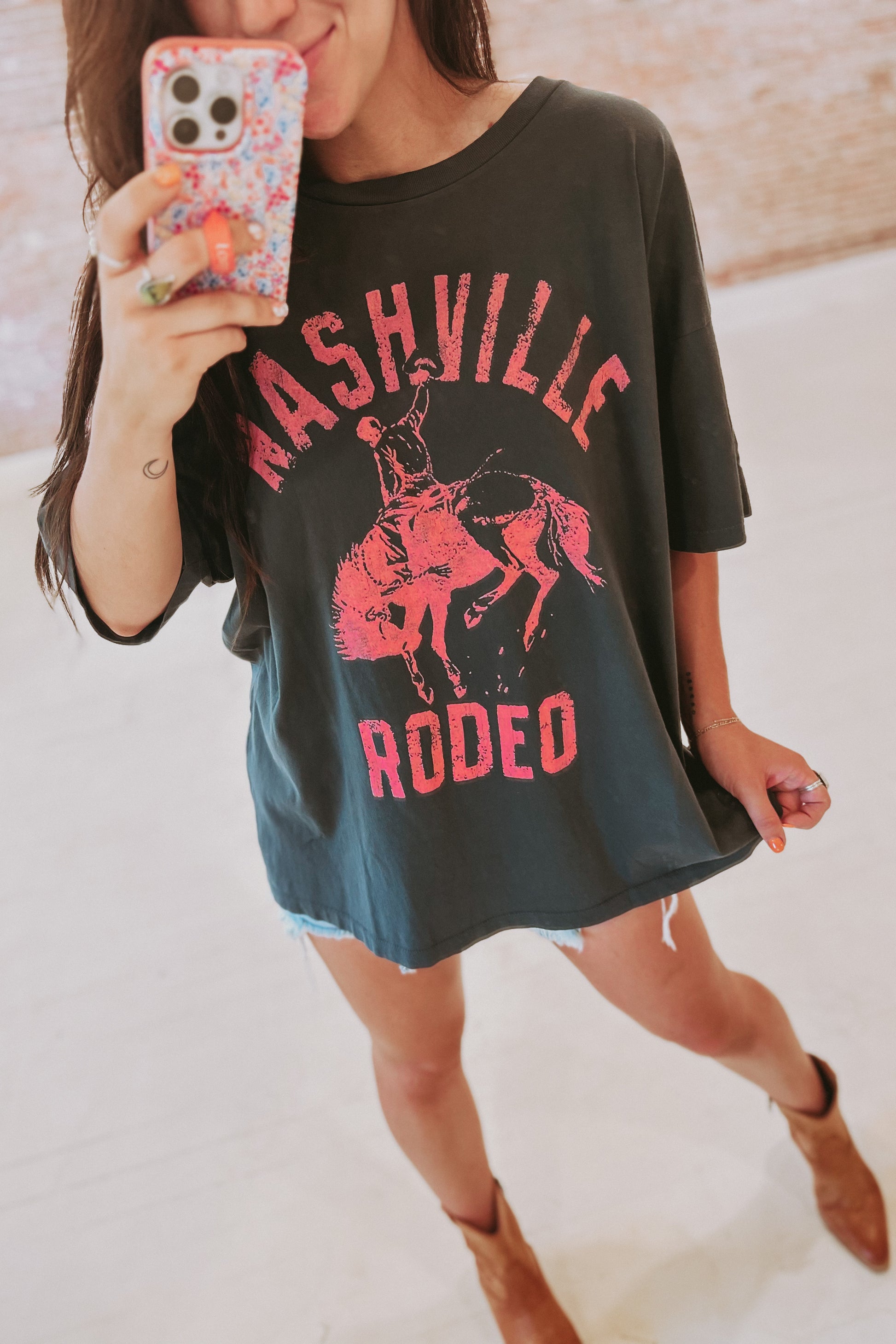 Hang on, a western inspired tee is here for the taking. Tributing the hometown of country music and the nation’s oldest honky tonks, this in-demand merch tee is marked with Nashville Rodeo. Accented with a bucking bronco graphic to really kick it into gear. Things are about to get rowdy.• Fits true to size, size up for an oversized look