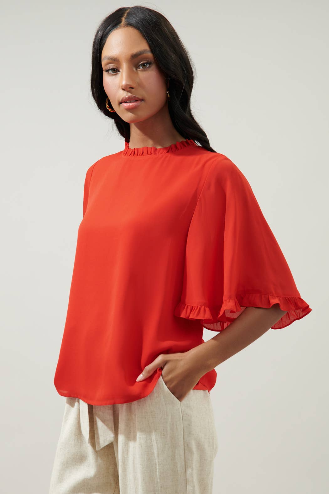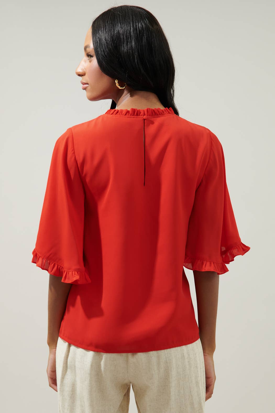 Fiery, floaty, and full of feminine flair the Spice Route Blouse is your new statement staple. With soft ruffle trim, flowy sleeves, and a bold chili red hue, she’s made for boss moves and date nights alike. Tuck her into denim or a tailored pant and let her do the talking. Available in store and online.