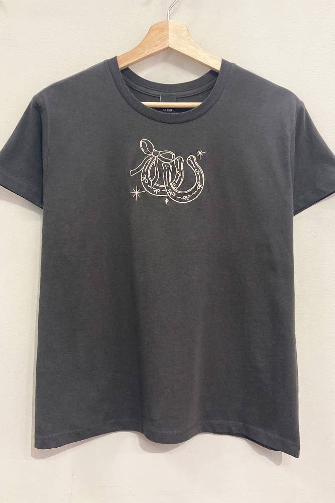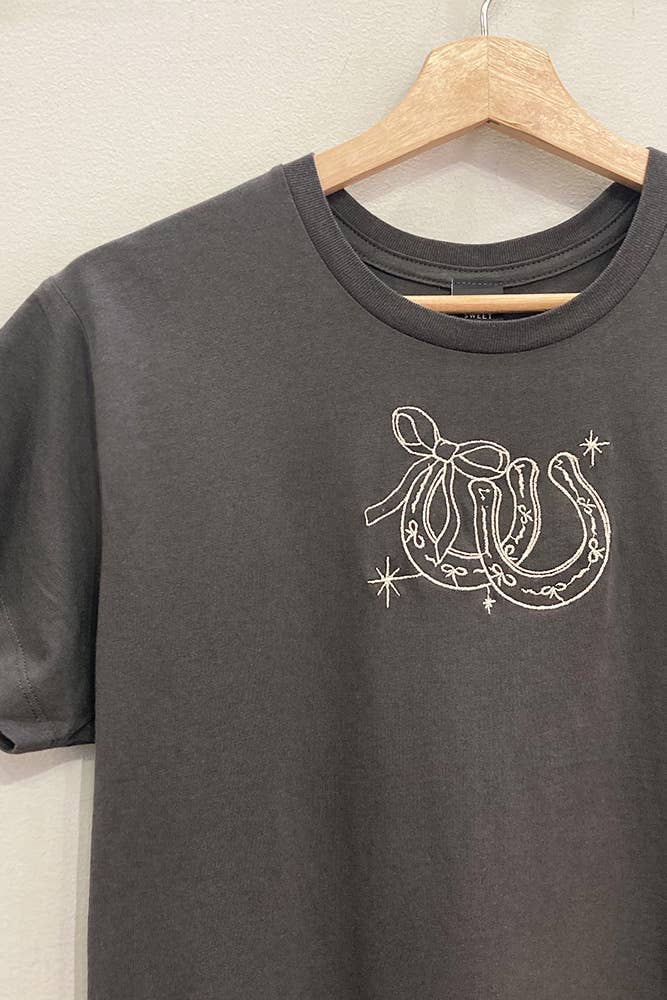 The Lucky Star Tee is your new go-to for everyday charm with a western twist. This soft, faded black top features a delicate embroidered horseshoe wrapped in a bow, with star accents that add just a little sparkle. She’s relaxed, dreamy, and ready to pair with your favorite denim, boots, or skirts. A little lucky, a little lovely — the perfect closet staple.